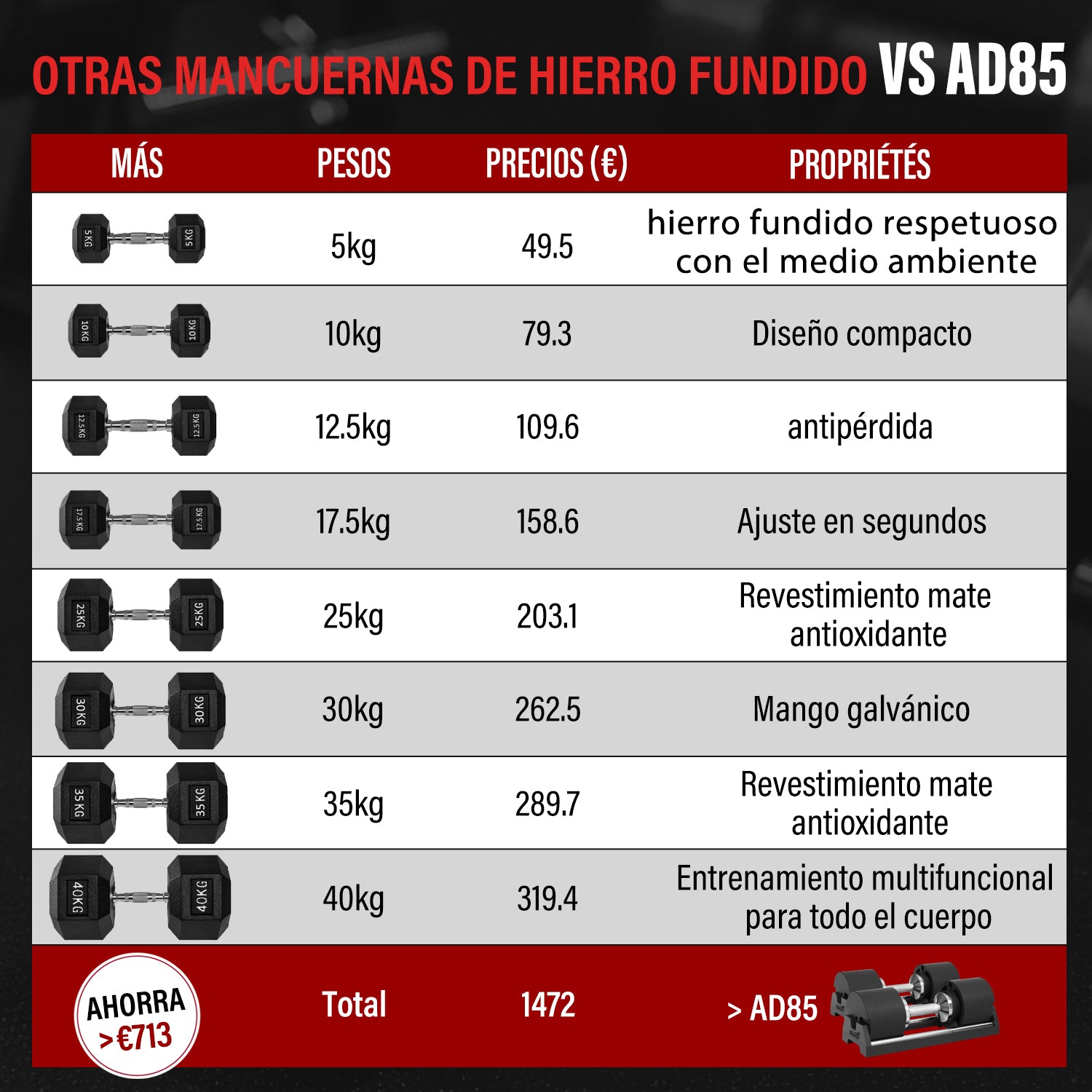 -Reemplazar 8 pares de mancuernas. (¡24 pares si utiliza nuestro sumador de peso magnético!)