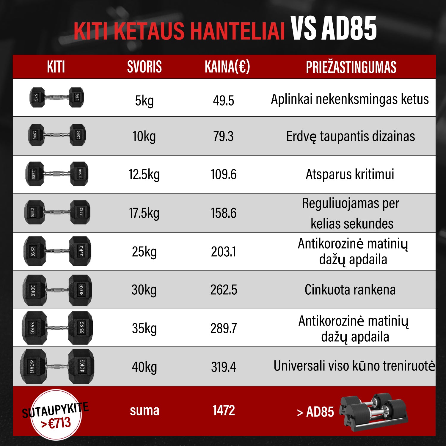 Sujunkite tekstą su vaizdu, kad išryškintumėte jūsų pasirinktą produktą, kolekciją ar tinklaraščio straipsnį. Pridėkite prieinamumą ar stilizaciją. Jūs netgi galite pateikti reitingą. „AD85“ hantelio rinkinyje naudojamos mažesnio skersmens plokštelės, kad išlaikytų pusiausvyrą treniruotės metu. Tirtingesnė 3,56 cm rankena taip pat užtikrina geresnę sukibimo patirtį. Jis skirtas bet kokio dydžio ir svorio žmonėms.